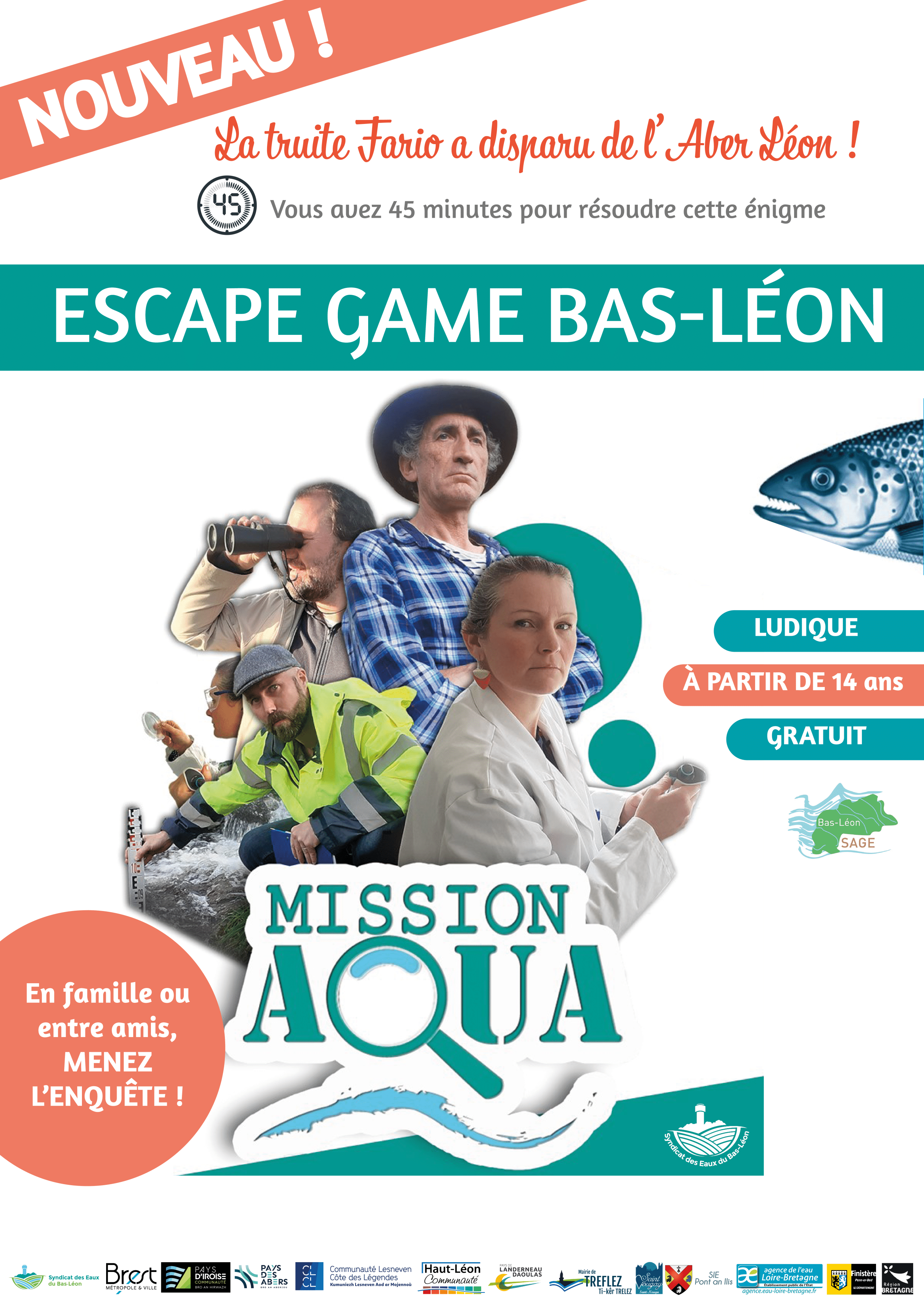 La truite Fario a disparu de l’Aber Léon ! En groupe de 3 à 8 personnes, vous aurez 45 minutes pour découvrir les dessous de cette mystérieuse disparition. Des boîtes à ouvrir, des hypothèses à vérifier, des clés ou des codes à trouver… L’équipe d’aquanautes devra être rusée et perspicace pour trouver la solution !